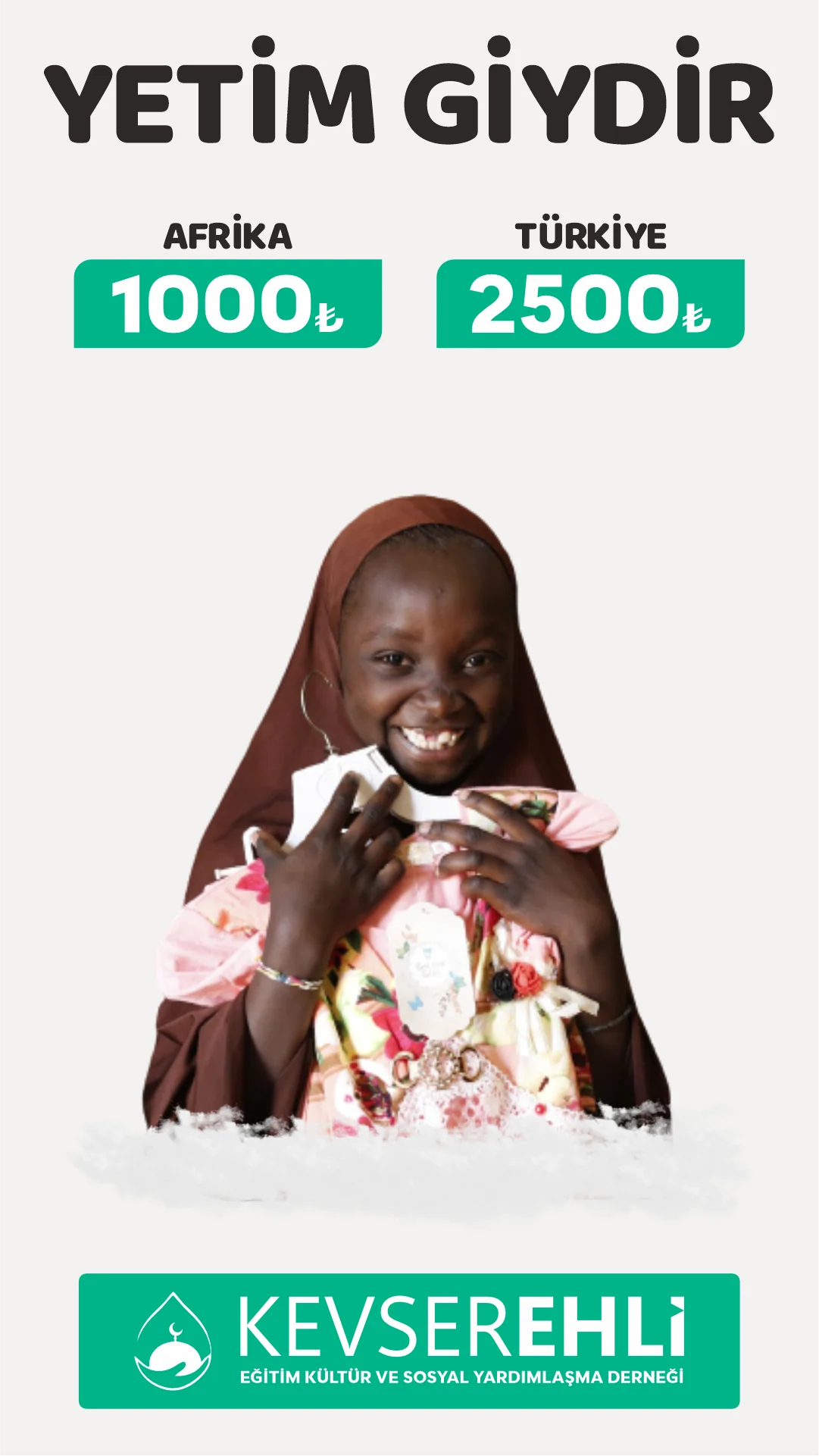 Kevserehli Derneği yurtiçi ve yurtdışında yetim evlatlarımızın yüzünü güldürmeye devam ediyor. Sizleren aldığı destek ile her ay düzenli olarak yetim giydirme kampanyası yapan Kevserehli Derneği sizlerin desteklerini bekliyor yurtdışı yetim giydirme bedeli 1000 Tl , Yurtiçi yetim giydirme bedeli 2500 Tl’dir.